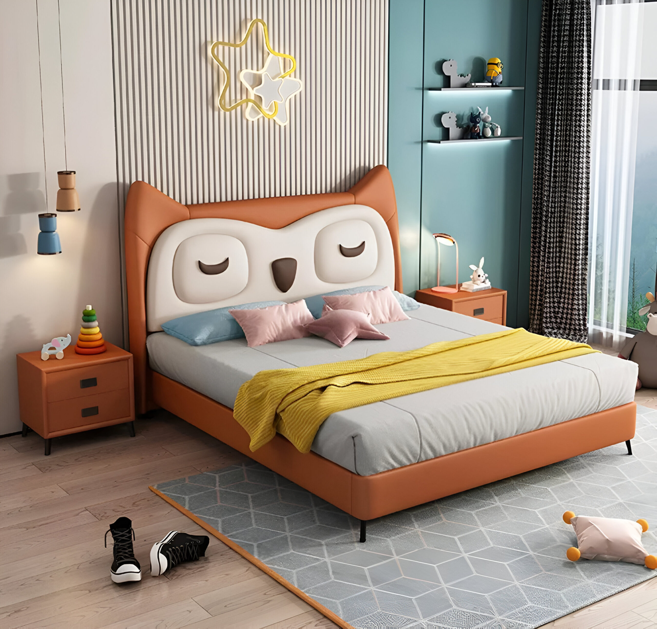 Ce modèle astucieux intègre des tiroirs discrets sous le lit, parfaits pour ranger les jouets, le linge de lit ou les vêtements, tout en optimisant l’espace. La tête de lit en forme de visage de hibou, aux couleurs douces et aux traits rassurants, crée un environnement apaisant propice au sommeil et à l’évasion. - Option sans rangement :